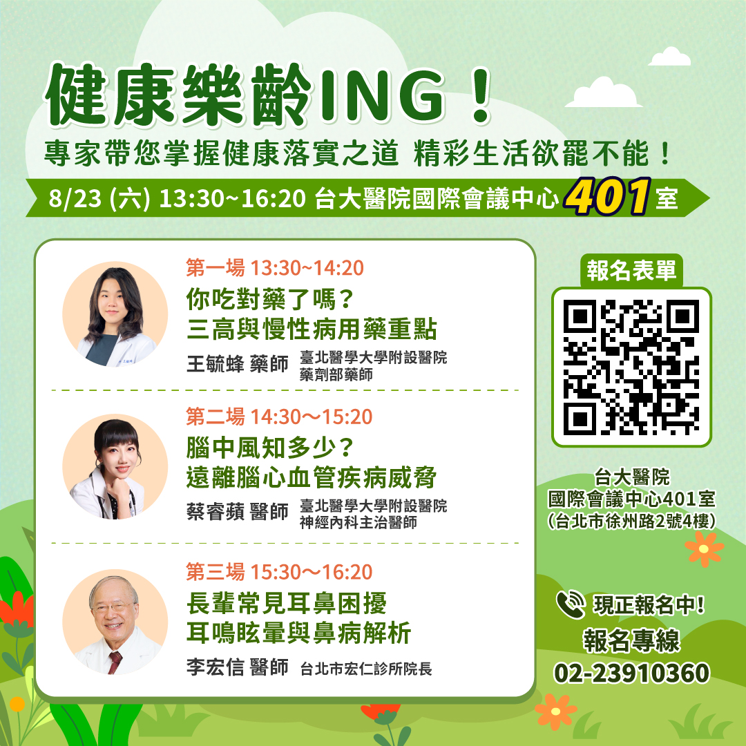 【已截止】8/23(六) 健康公益講座︰健康樂齡ING! 專家帶您掌握健康落實之道 精彩生活欲罷不能!