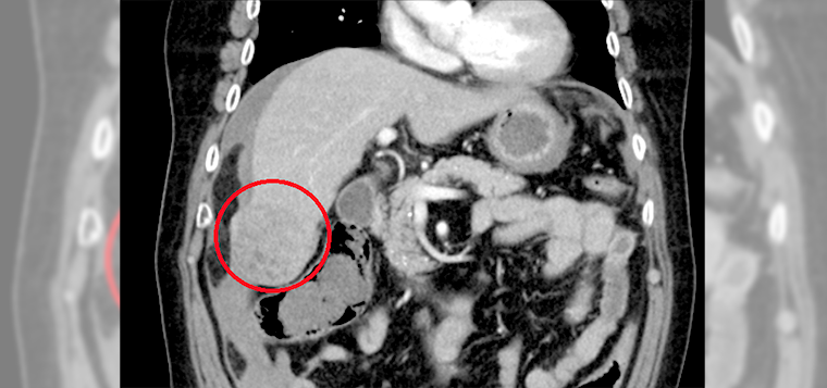 ▲電腦斷層檢查發現患者肝臟有1處5公分大腫瘤。(圖/台北慈濟醫院提供)
