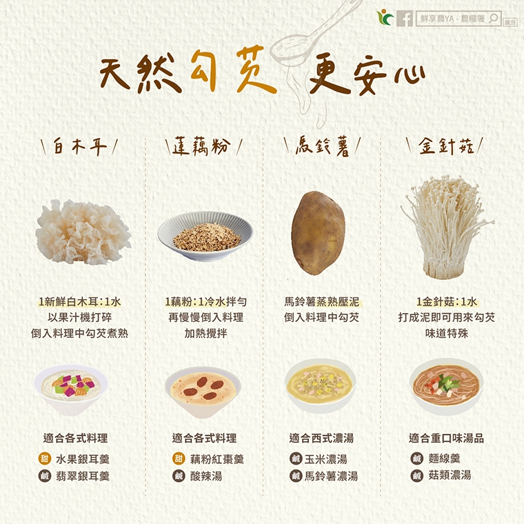 「鮮享農YA-農糧署」粉絲專頁提到,白木耳、蓮藕粉、馬鈴薯、金針菇可作為天然勾芡食材,不論是炒菜、煮湯都要來點勾芡,都可提升料理層次與美味。