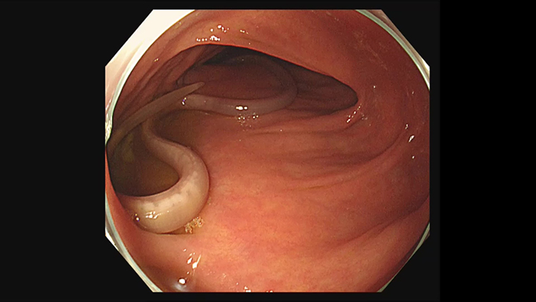 ▲腸胃內科醫師經由大腸鏡檢查在病人腸道中發現蛔蟲。(圖/大林慈濟醫院提供)