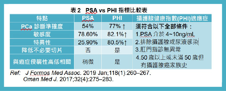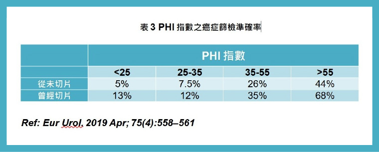 PHI是由3種PSA血中成分(total PSA、free PSA與[-2]proPSA)計算出的綜合指標,能更精準反映罹患攝護腺癌的風險。根據亞洲及臺灣的研究顯示,PHI的準確度遠優於單純PSA以及過去比較常見的free PSA,對於區分良性攝護腺增生與癌症,具有顯著的輔助價值。舉例而言,PHI值大於55者,其罹癌風險平均可達44至68%;若僅介於25至35則風險可能僅約26至35%。如此即可協助醫師與病人依據風險高低,決定是否要進行組織切片,減少不必要的檢查與併發症,也減輕病人的焦慮情緒。