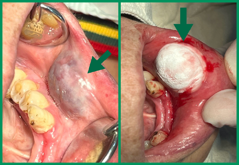 ▲左圖為良性口腔血管病變常在舌、頰黏膜、口底等部位出現紅紫或藍紫色外觀(箭頭所示);右圖為良性口腔血管病變利用冷凍槍凍結壞死病灶(箭頭所示)。(圖/長庚醫院提供)