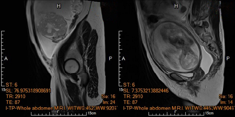 由於孕婦反映有明顯的進食與呼吸困難疑似腸胃道問題,為求謹慎,針對腹水檢體進行細胞檢驗,雖未能於腹水內發現癌細胞,腹部核磁共振影像顯示腫瘤疑似來自左側卵巢,且惡性風險極高,高度懷疑是懷孕中合併卵巢癌。