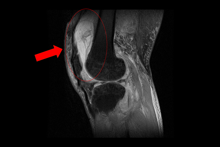 ▲個案的磁振造影顯示膝蓋內已有大量積液並出現化膿的情形。(圖/台中慈濟醫院提供)