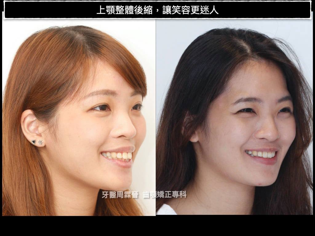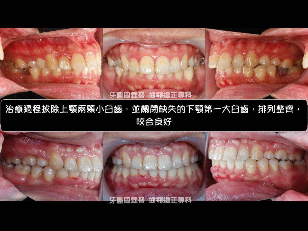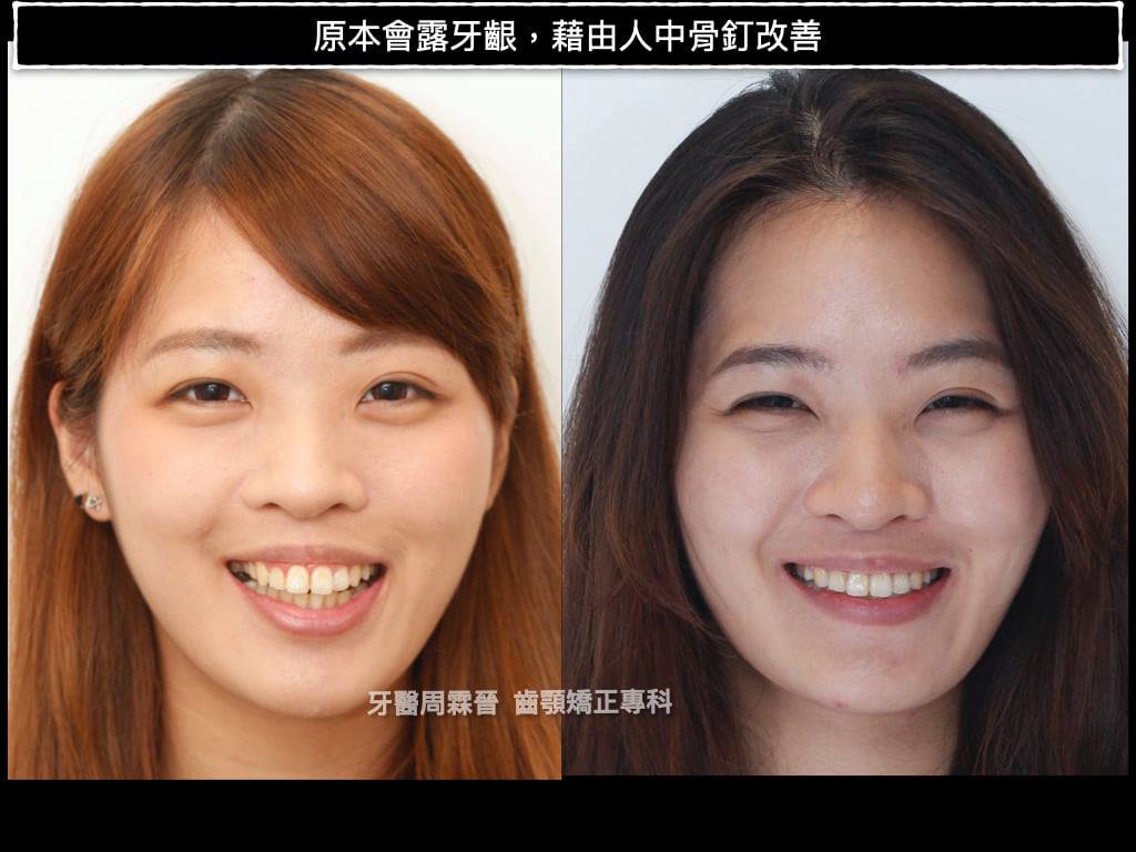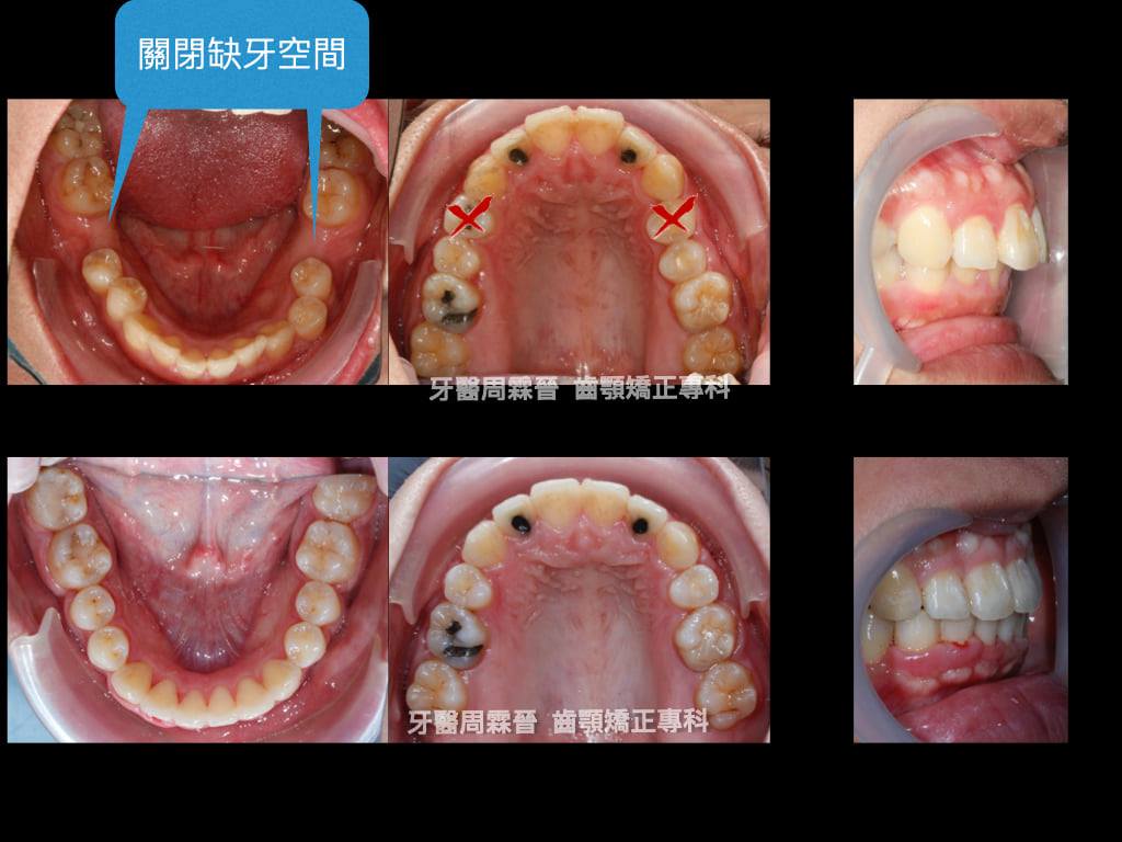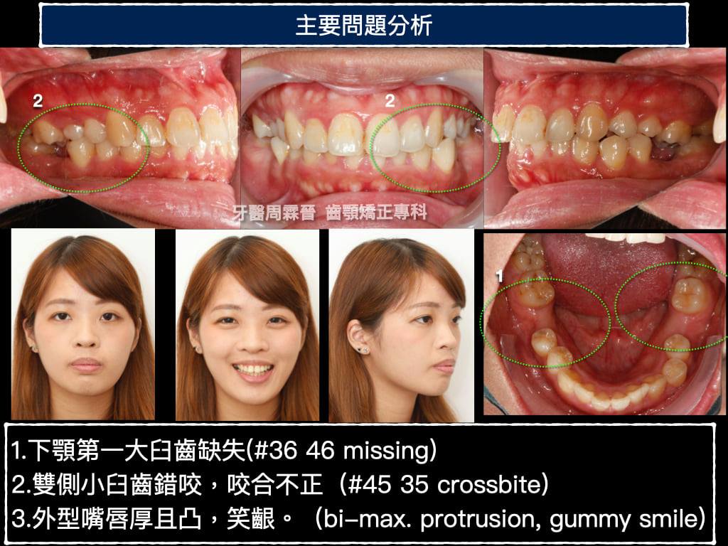 這個case難上加難的是下顎第一大臼齒又被拔掉了,光要關閉這一公分的空間,就要花上很多時間,此外又有輕微的笑齦,因此治療期間上顎總共打了三支骨釘(左右IZC + 人中骨釘)經過2年10個月辛苦的治療,終於把病患變得更美!