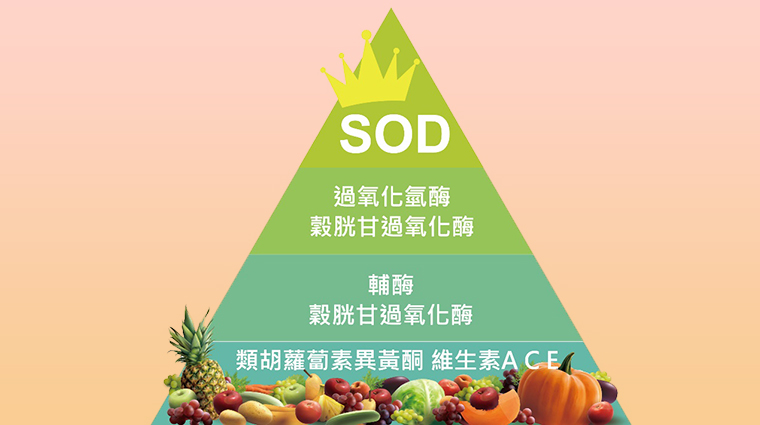 SOD(superoxide dismutase)是人體可自行合成的酵素型抗氧化物,同時也是體內對抗自由基的第一道防線,保護細胞不受氧化傷害。但隨著年齡增長、外在壓力、環境污染、生活步調加快的影響下,導致自由基加倍產生,而體內SOD含量大幅下降,所以需要透過飲食積極攝取,保持健康,預防老化。