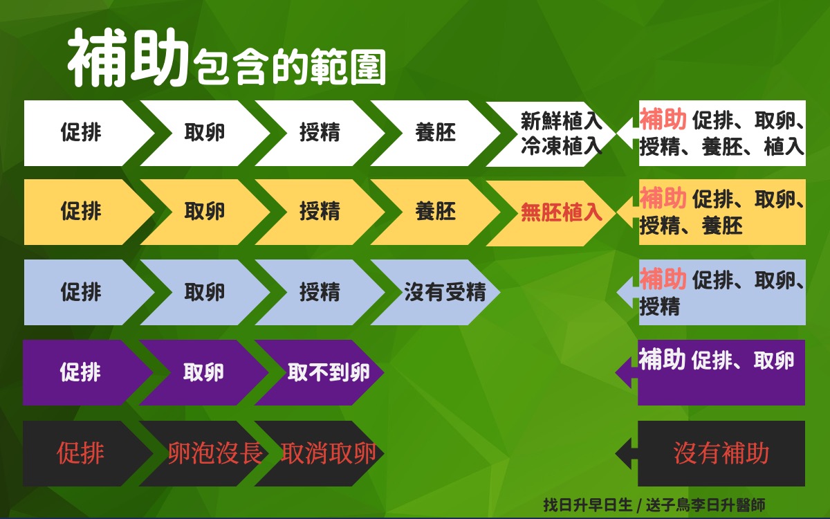 每個療程,如果順利進行,就可以補助「促排、取卵、授精、養胚、植入」。