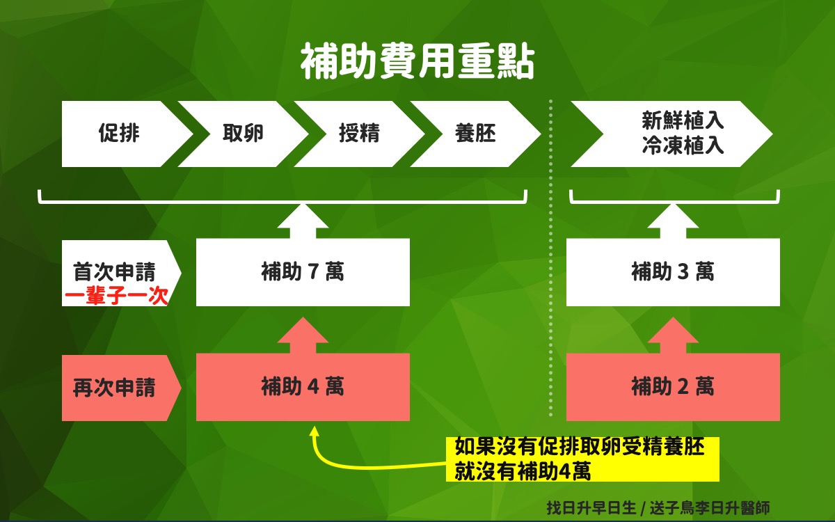再次給大家看一下補助費用的重點。每一次申請,都可以包含取卵養胚,如果沒有申請取卵養胚,補助費用會比較低。所以,想要申請到最多的補助費用,申請補助療程一定要包含取卵授精養胚,才能申請到最多的費用。