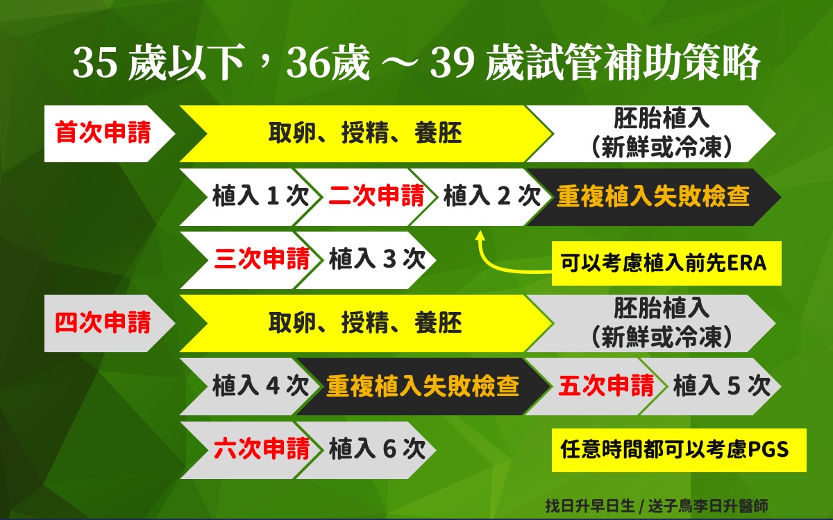35歲以下,以及36 ~ 39歲,因為都可以申請「6次」補助療程,所以我們可以這樣安排: