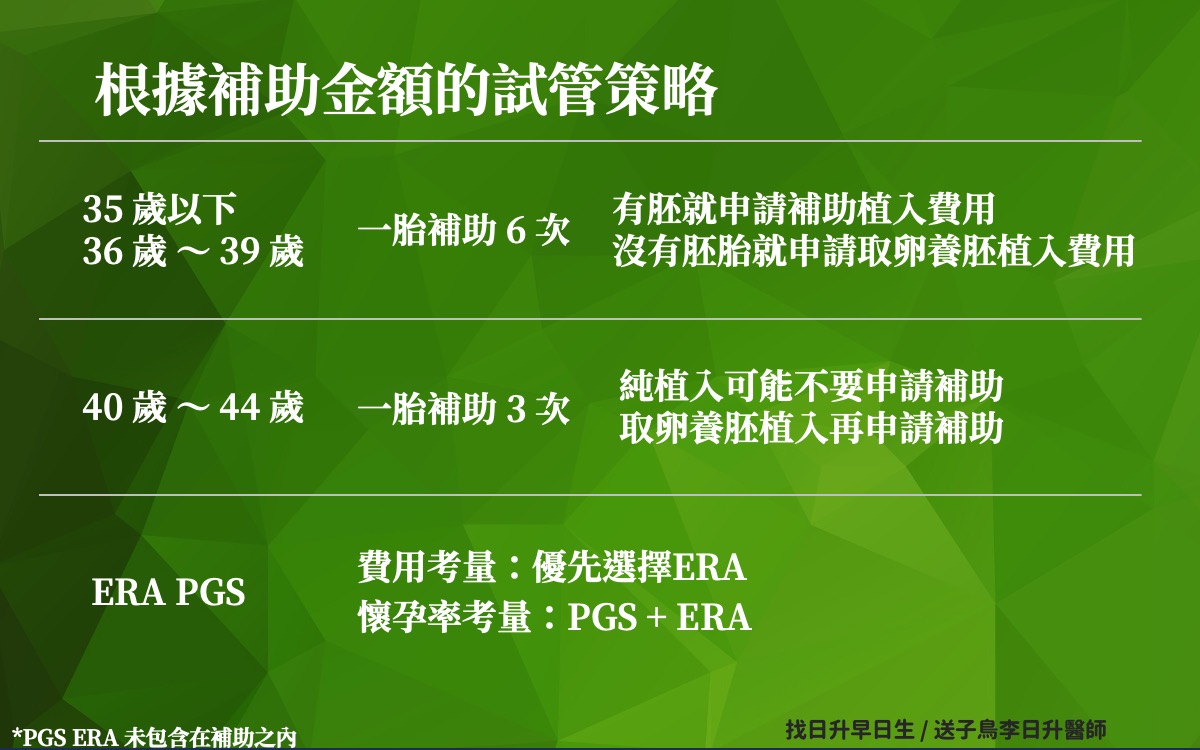 策略就是35歲以下,如果有胚胎,就申請補助「胚胎植入」;如果沒有胚胎,就申請補助「取卵養胚植入」。
