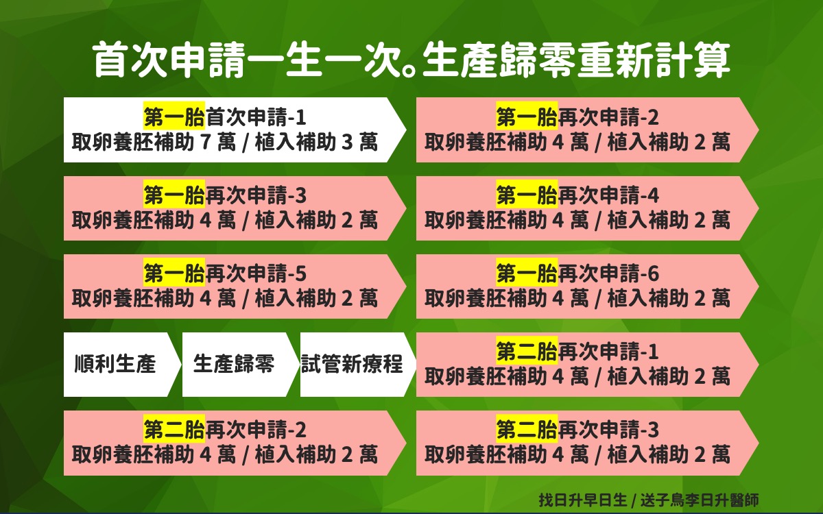 「第1次取卵+第1次植入」申請第一輪補助,然後第2次植入申請第二輪補助,第3次植入申請第三輪補助。