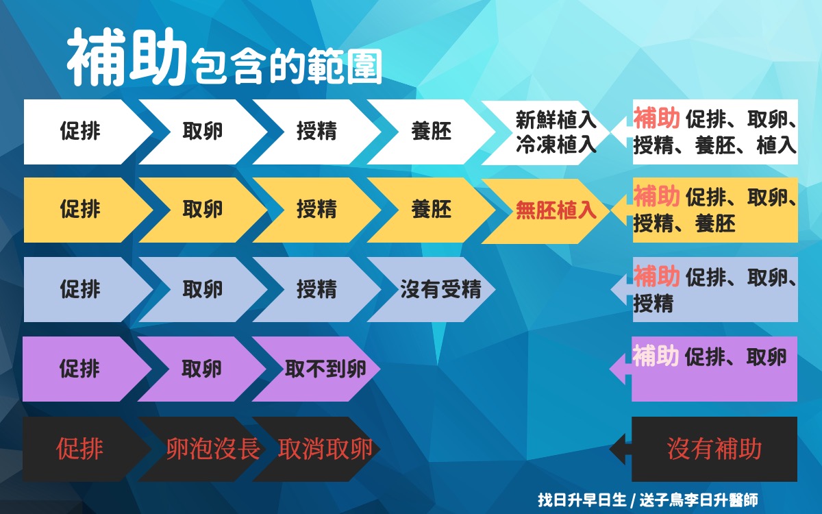 每個療程,如果順利進行,就可以補助「促排、取卵、授精、養胚、植入」。