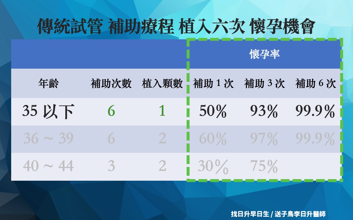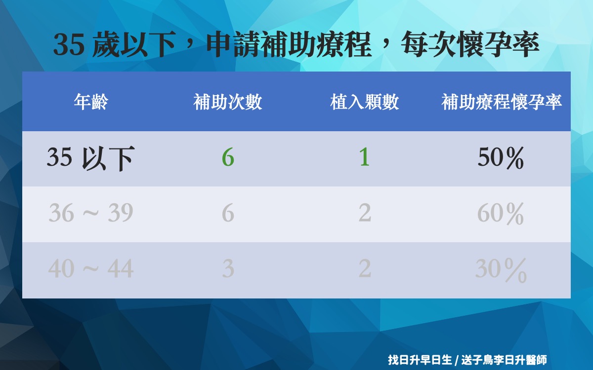 根據統計推算,這樣補助療程,每一次植入一顆,累積三次,累積的懷孕率是 93%,每一次植入一顆,累積六次,累積的懷孕率是 99.9%。