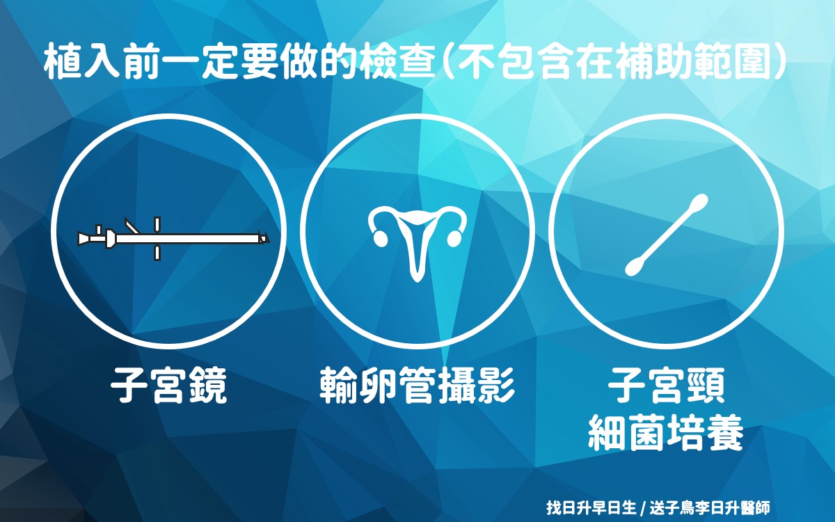 另外,醫學專業考量,如果植入兩次都未能成功著床,需要考慮做「重複植入失敗檢查」,找出著床失敗的原因,提高下次懷孕的機會。(這部分檢查不包含在補助內)