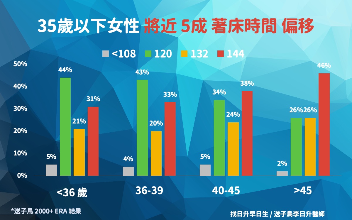 傳統觀念,囊胚要在第五天植入,也就是使用黃體素 120小時的時候植入。但是,送子鳥統計2000多個 ERA 結果發現,小於 36 歲女性,只有 44%,著床時間是傳統認為的第五天(120小時),其他有21%,要晚半天(132小時),有31 % 要晚一天(144小時)植入,才有機會著床。