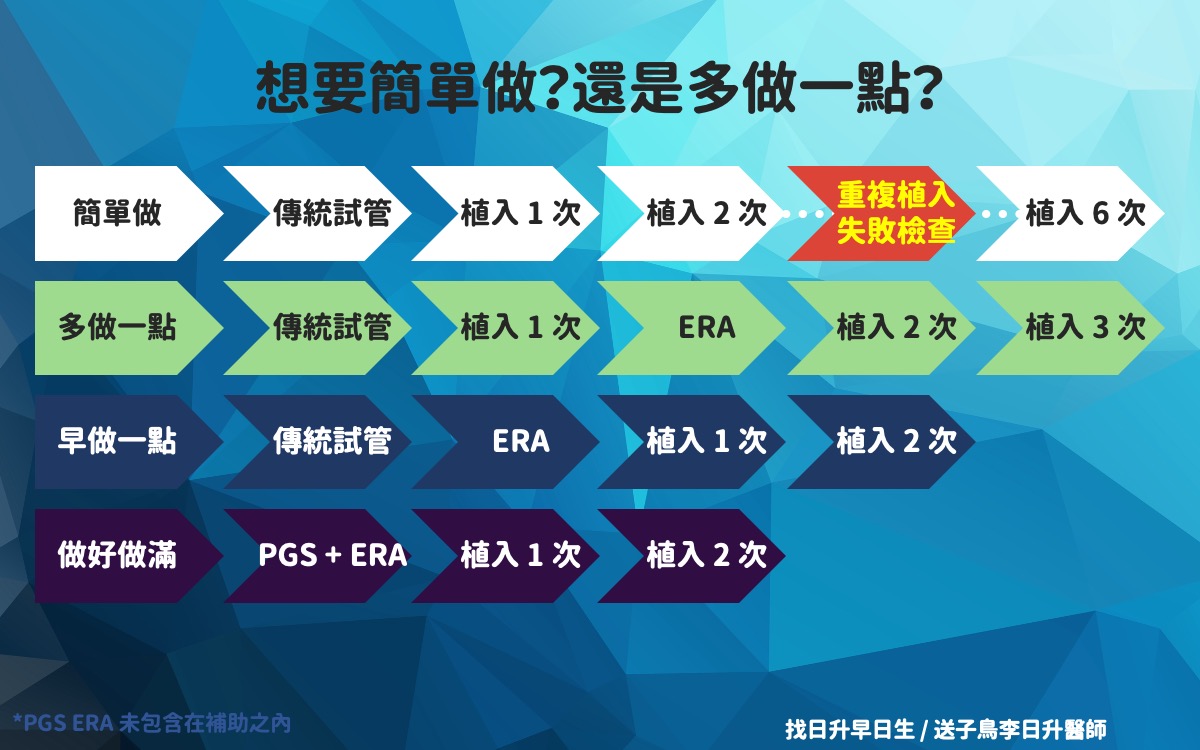簡單做,就是依照傳統作法,取卵後植入、植入未成就再試試看。如果 ERA沒有偏移,夫妻染色體也是正常,一般植入六次應該會成。