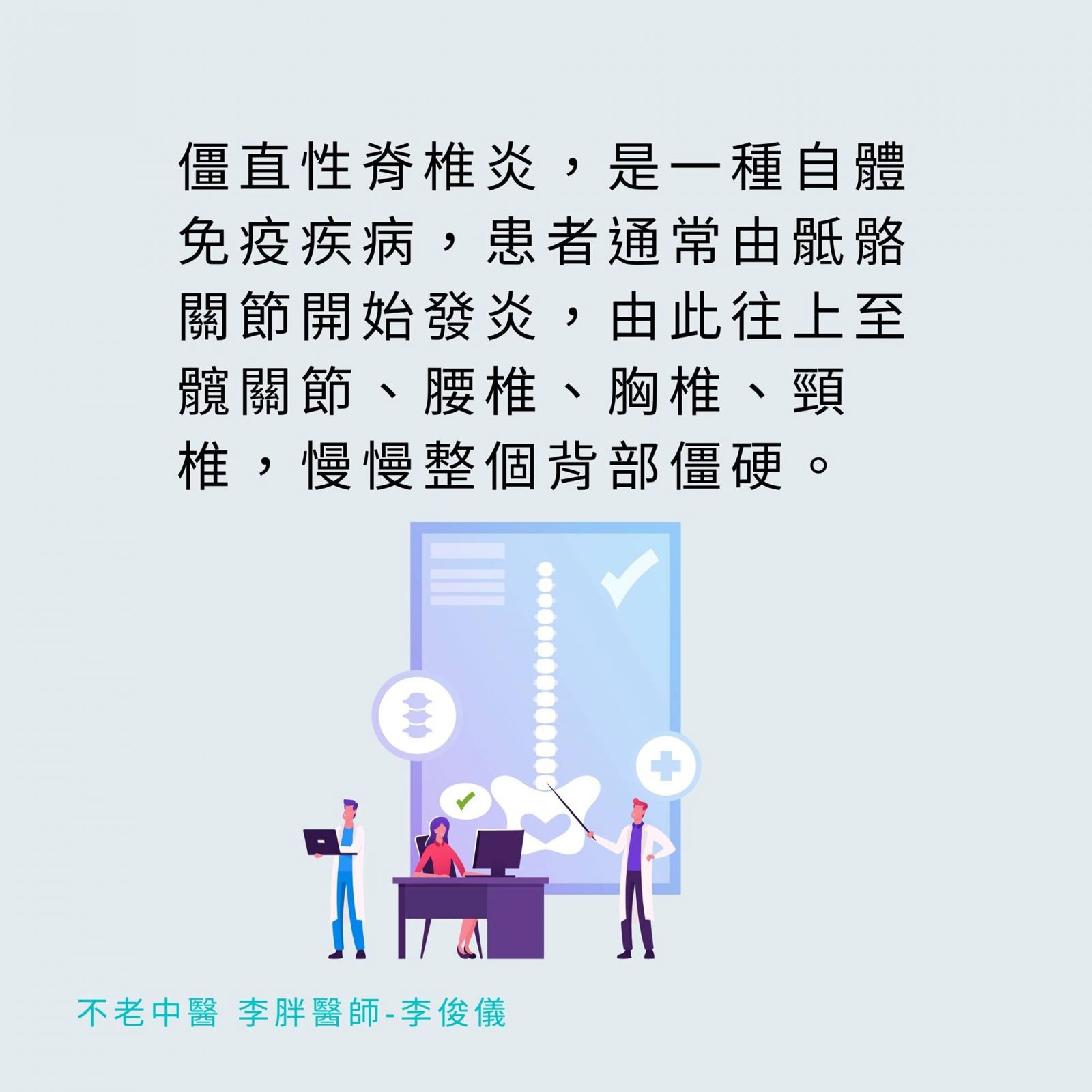 今天接續上周要講的是 #僵直性脊椎炎 ,這是一種自體免疫疾病,僵直性脊椎炎患者通常由 #骶骼關節 開始發炎,由此往上至髖關節、腰椎、胸椎、頸椎,整個背部會慢慢僵硬。