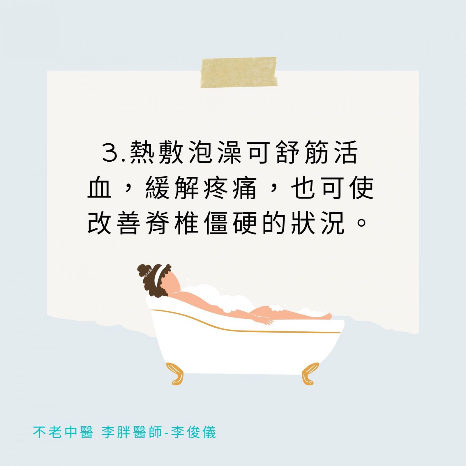 熱敷泡澡可舒筋活血,緩解疼痛,也可使改善脊椎僵硬的狀況。