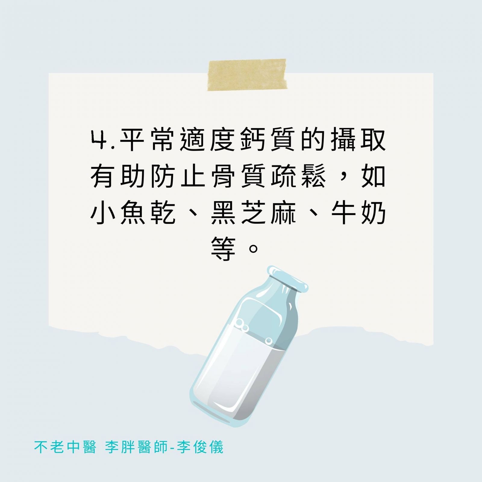 平常適度鈣質的攝取有助防止骨質疏鬆,如小魚乾、黑芝麻、牛奶等。