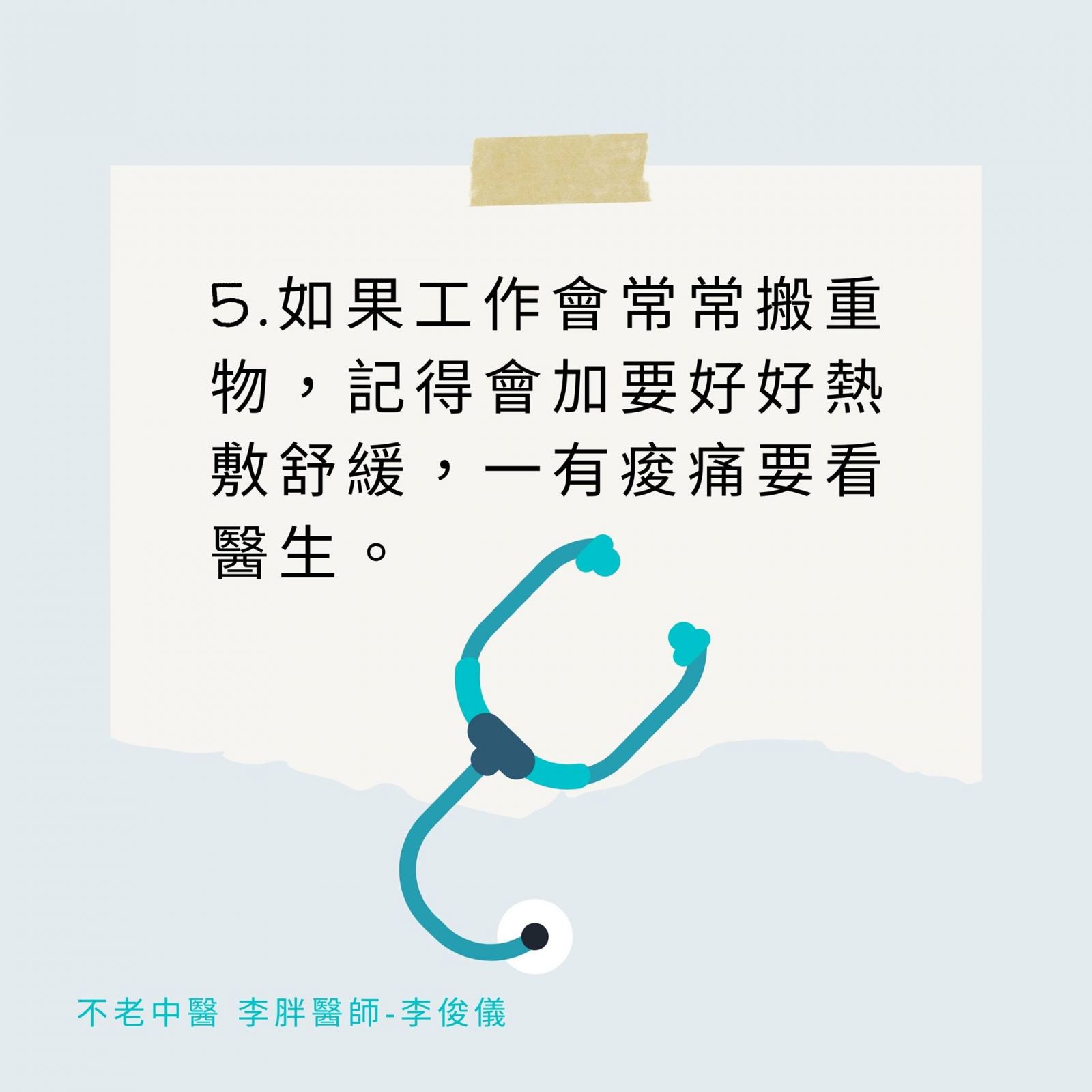 如果工作會常常搬重物,記得會加要好好熱敷舒緩,一有痠痛要看醫生。