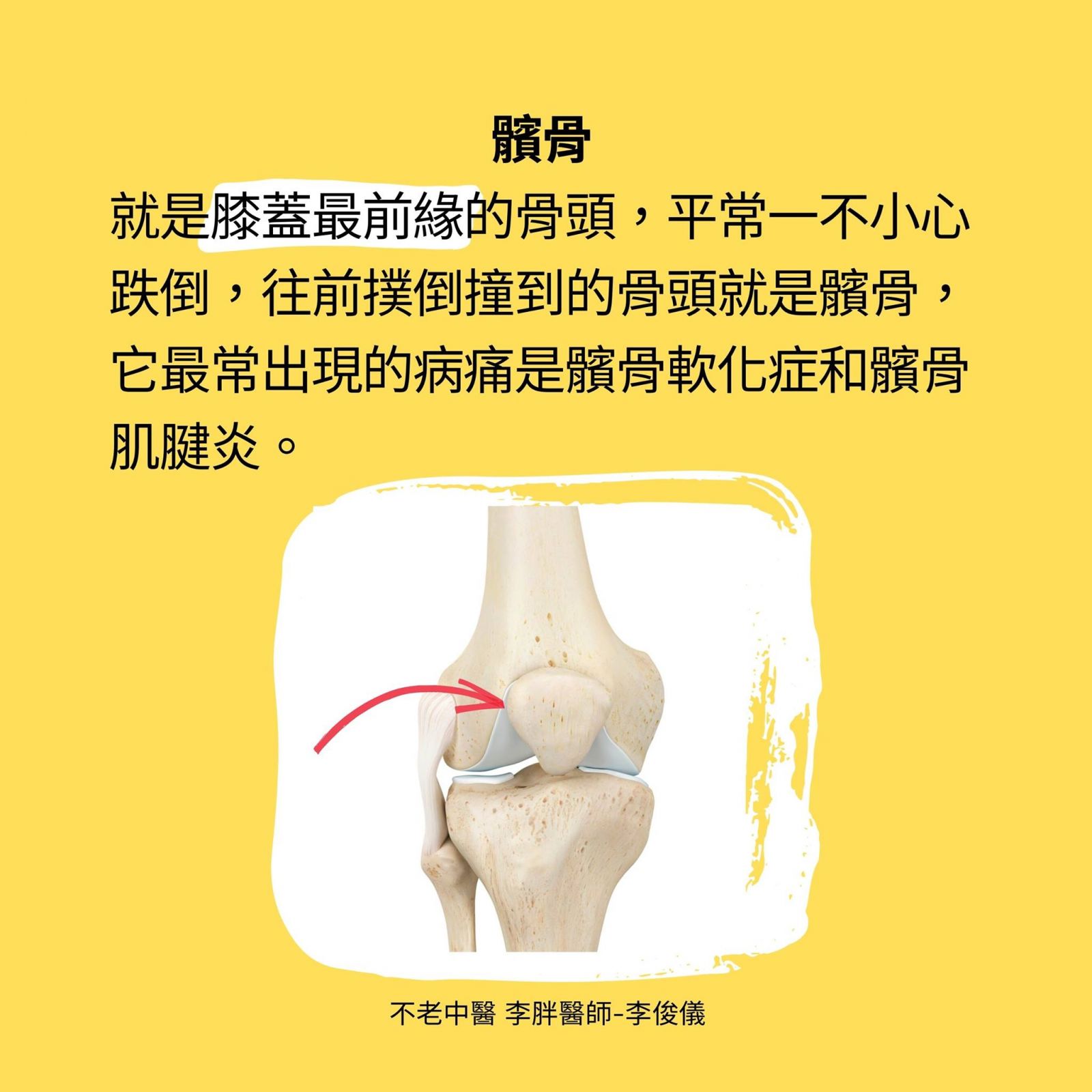 它就是膝蓋最前緣的骨頭,平常一不小心跌倒,往前撲倒撞到的骨頭就是髕骨,它最常出現的病痛是髕骨軟化症和髕骨肌腱炎,至於髕骨骨折就交給醫院去手術。