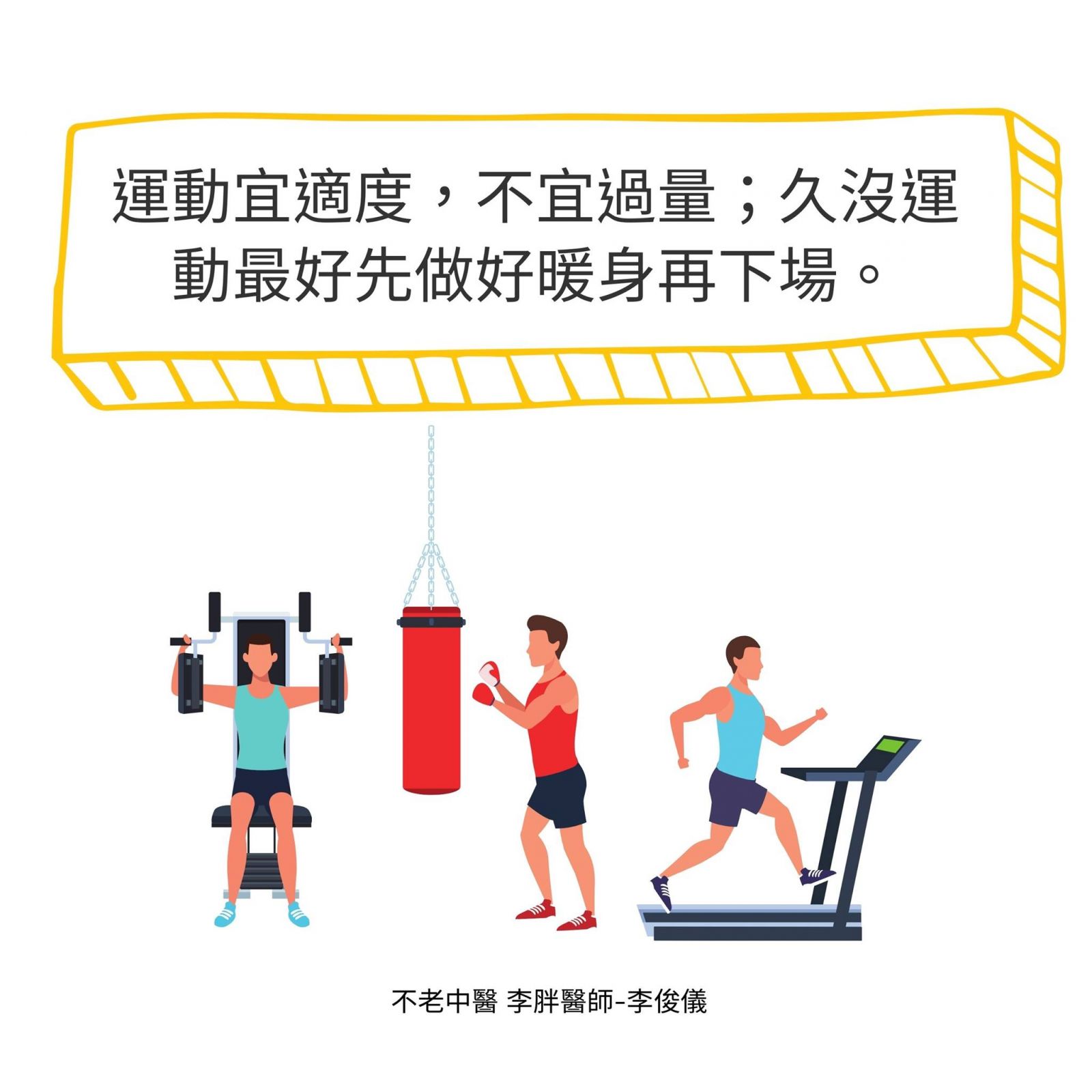 1. 運動宜適度,不宜過量;久沒運動的身體,最好先做好暖身再下場。