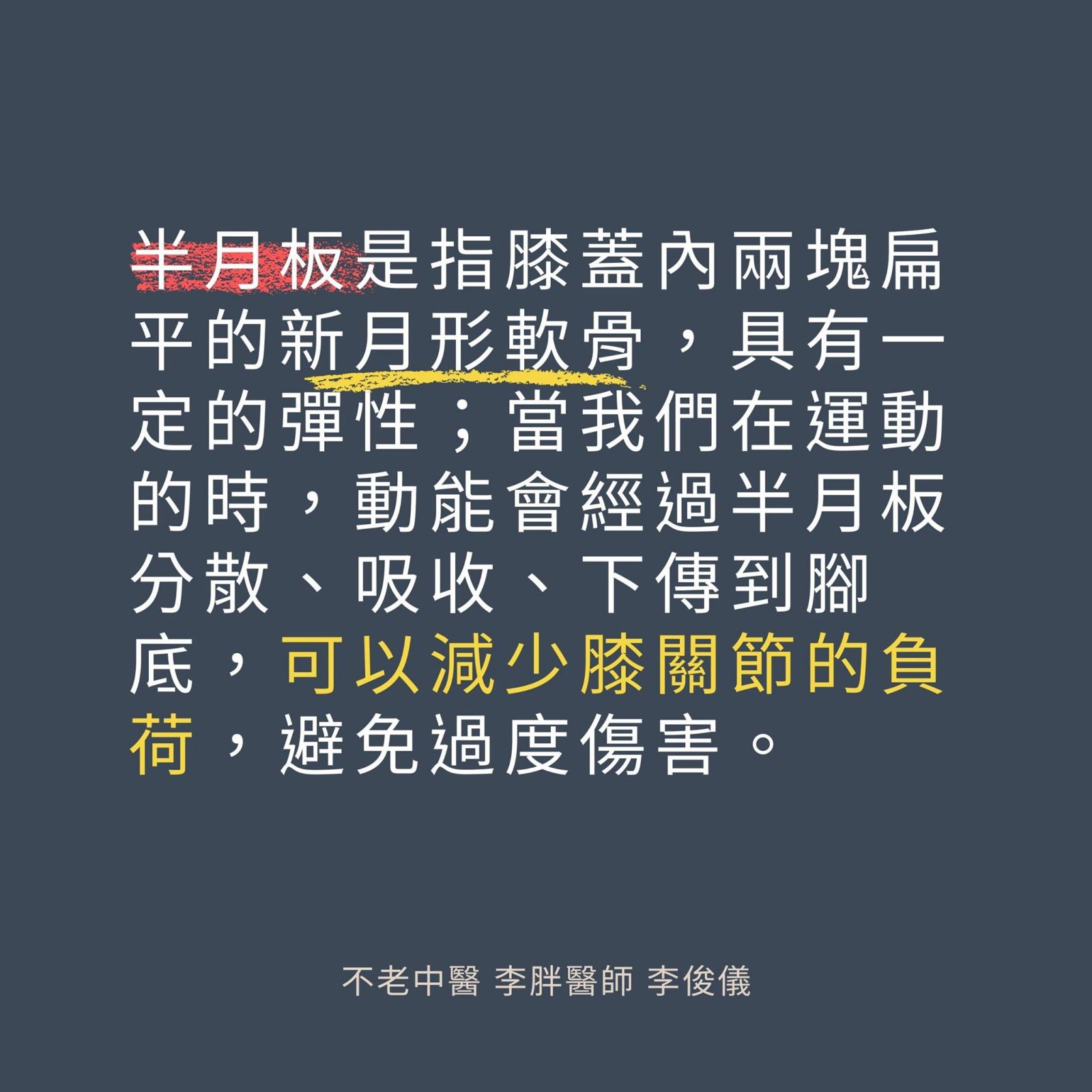 半月板是指膝蓋內兩塊扁平的 #新月形軟骨,具有一定的彈性;當我們在運動的時,動能會經過半月板分散、吸收、下傳到腳底,可以減少膝關節的負荷,避免過度傷害。