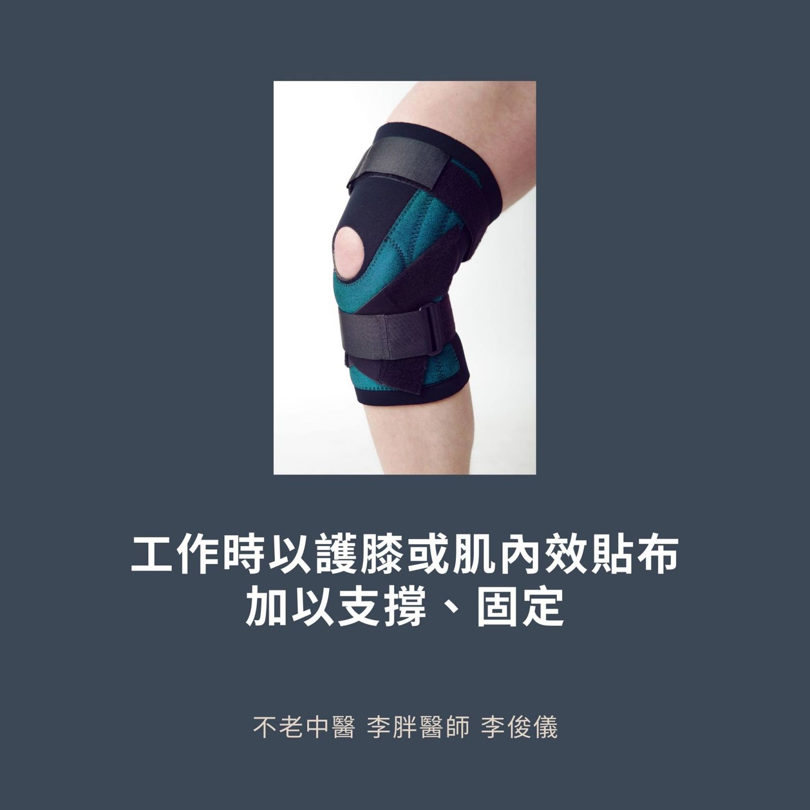 1. 工作時以護膝或肌內效貼布加以支撐、固定,避免再次受傷造成二度傷害。