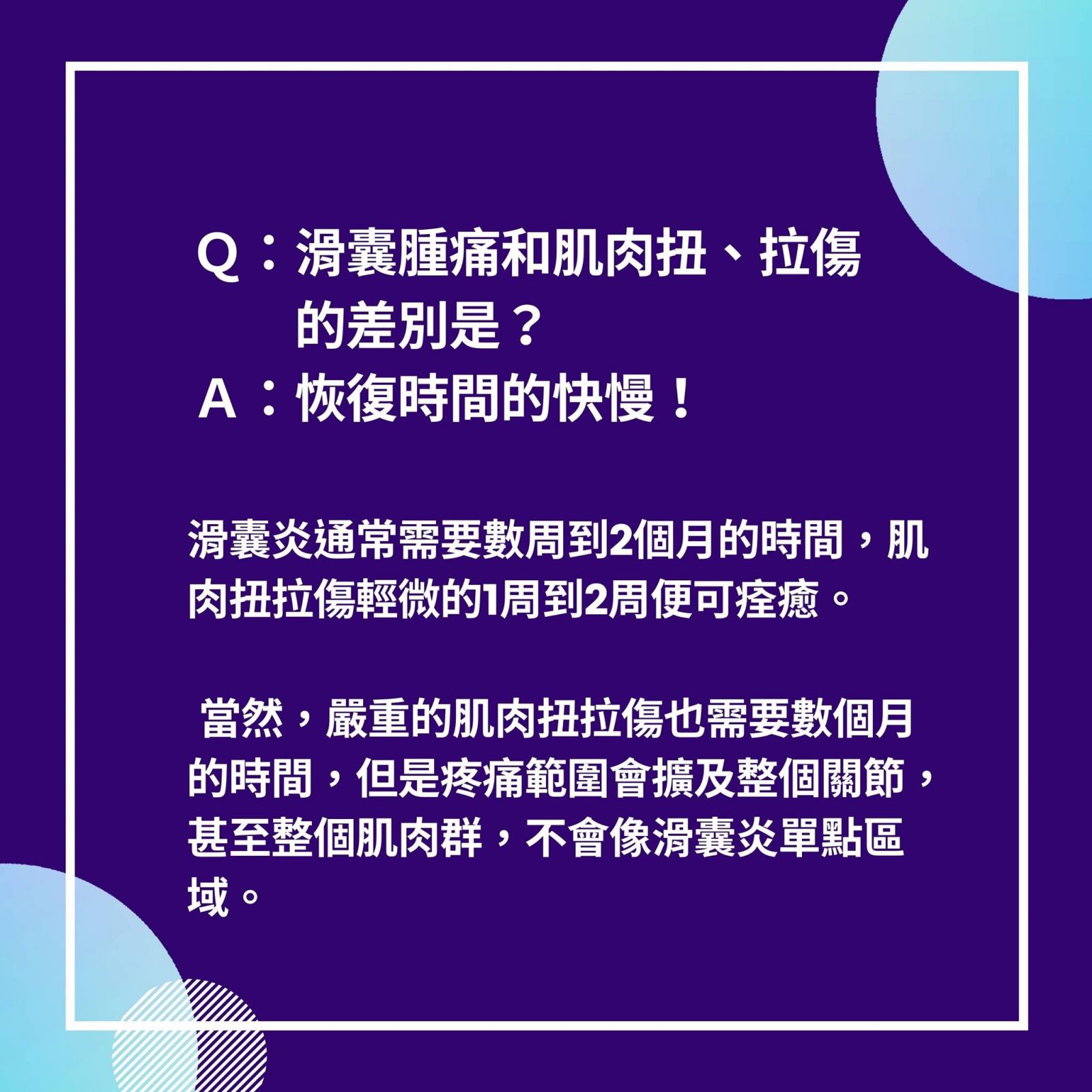 當然,嚴重的肌肉扭拉傷也需要數個月的時間,但是疼痛範圍會擴及整個關節,甚至整個肌肉群,不會像滑囊炎單點區域。