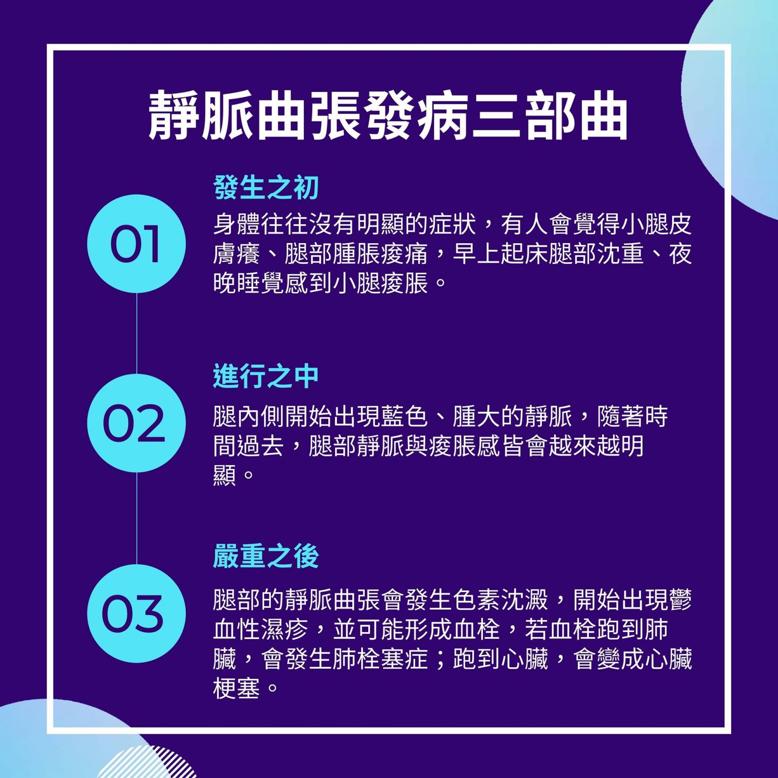 3. 嚴重之後,腿部的靜脈曲張會發生 #色素沈澱,開始出現 #鬱血性濕疹,並可能形成 #血栓,若血栓跑到肺臟,會發生肺栓塞症;跑到心臟,會變成心臟梗塞。