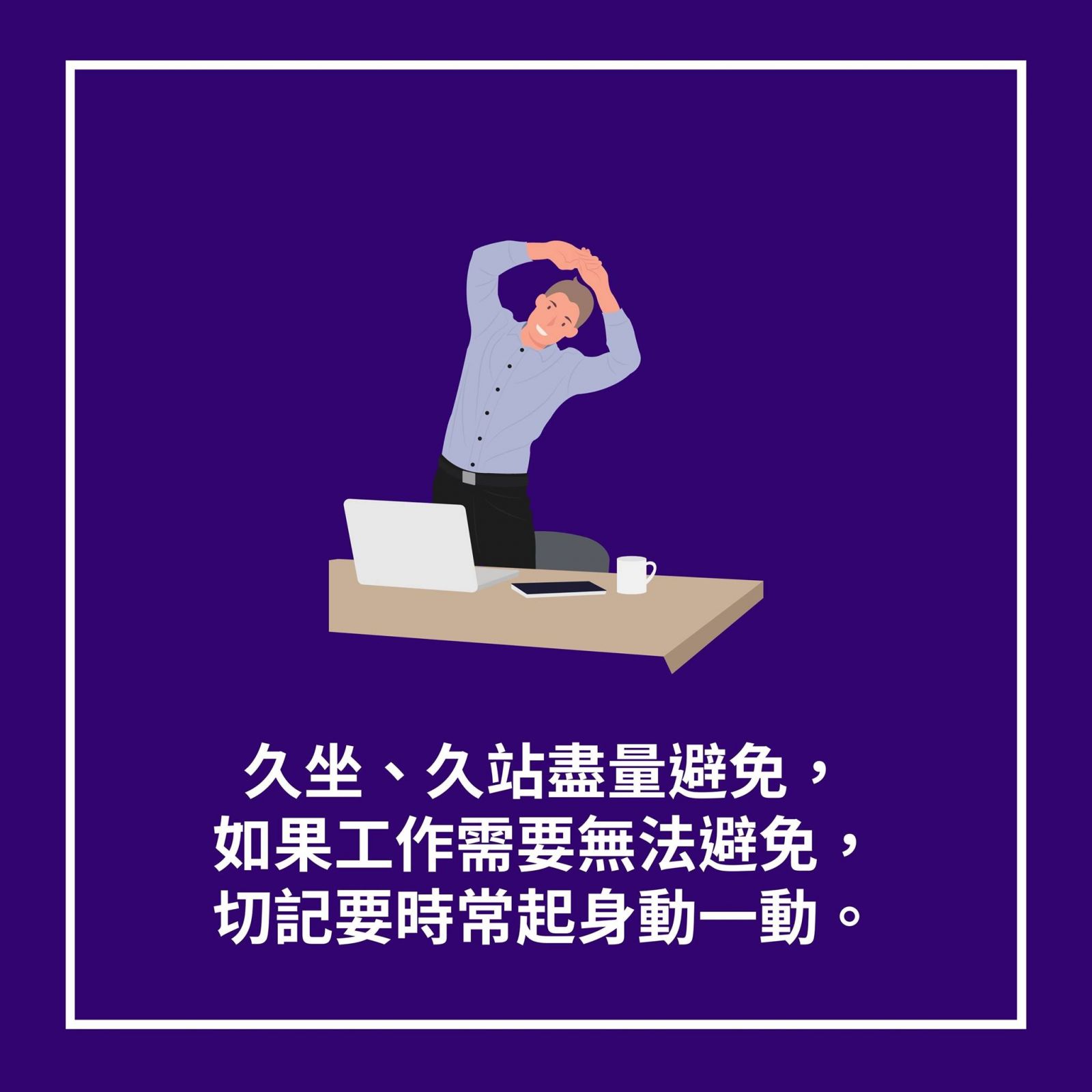3. #久坐、#久站盡量避免,如果工作需要無法避免,切記要時常 #起身動一動。