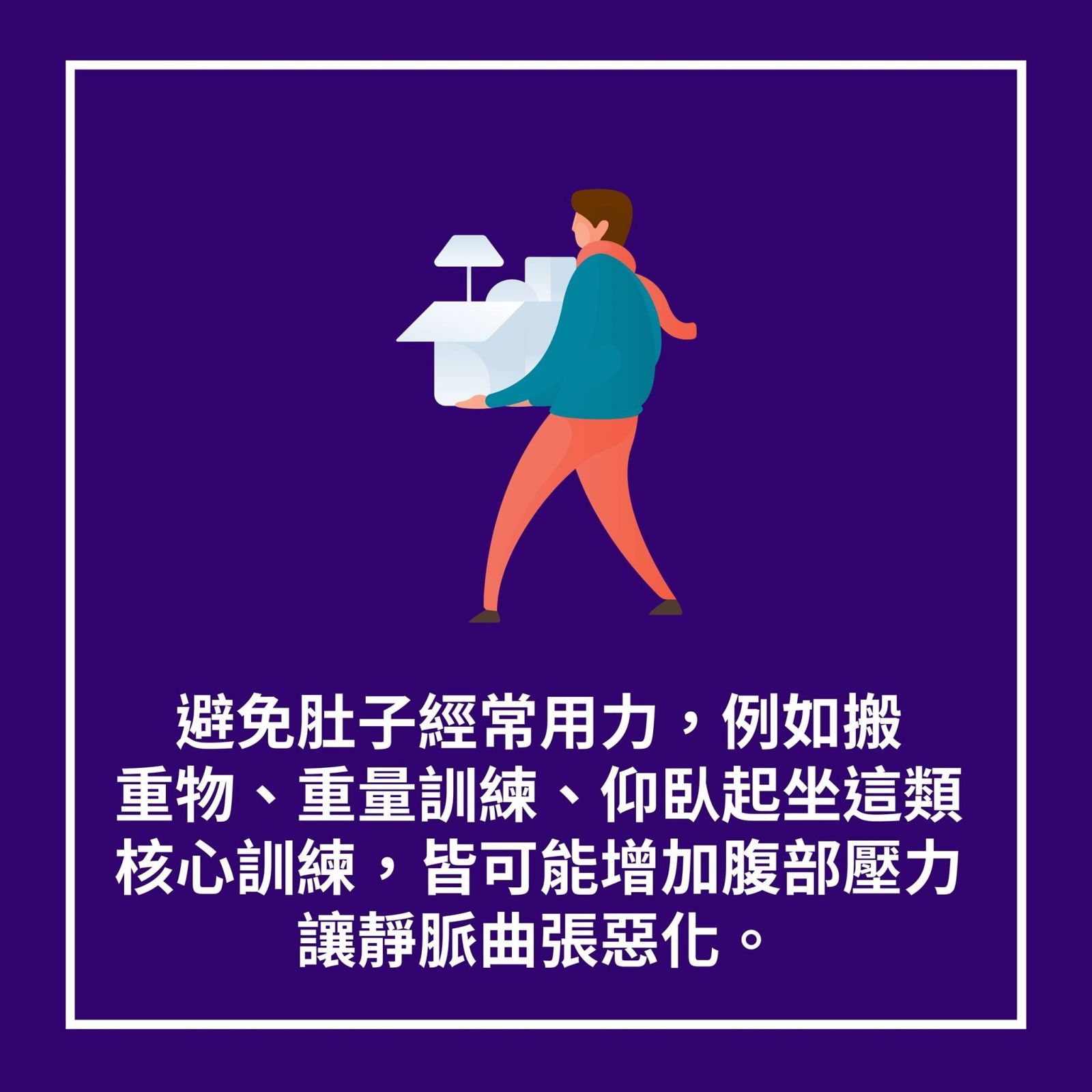 5. #避免肚子經常用力,例如搬重物、重量訓練、或仰臥起坐這類核心訓練,皆可能增加腹部壓力讓靜脈曲張惡化。