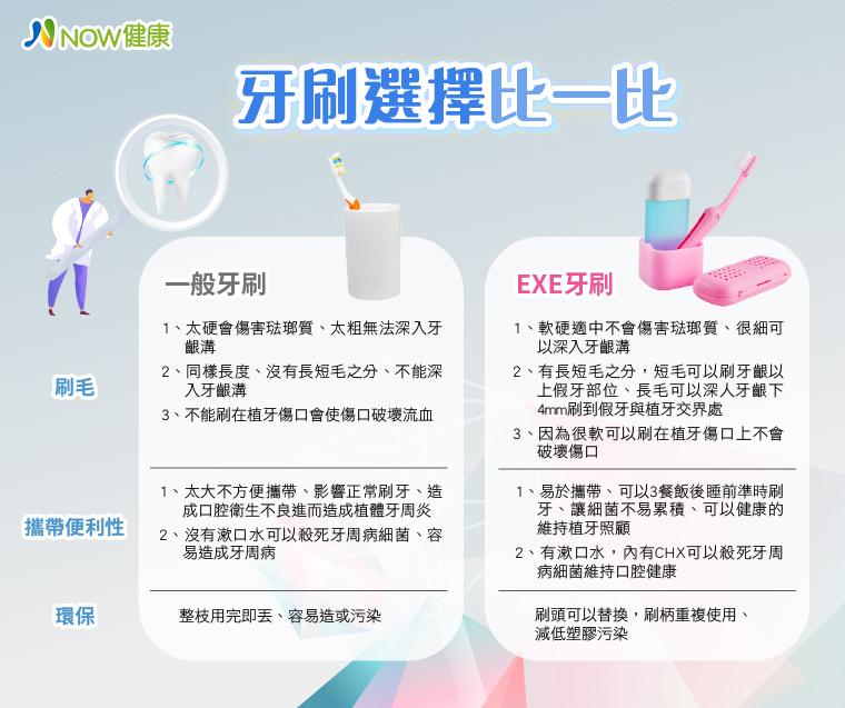 ▲牙刷選擇比較一覽表。(資料來源/EXE卓品國際;圖/NOW健康製作)