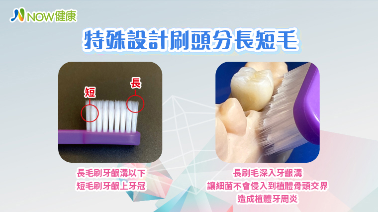 ▲長刷毛超過短刷毛4mm,可以深入植牙與假牙交接處,有效預防牙結石和細菌滋生,短刷毛則可清潔牙齦上方牙冠處,針對縫隙和牙齦溝能達到徹底清潔。(資料來源/EXE卓品國際;圖/NOW健康製作)