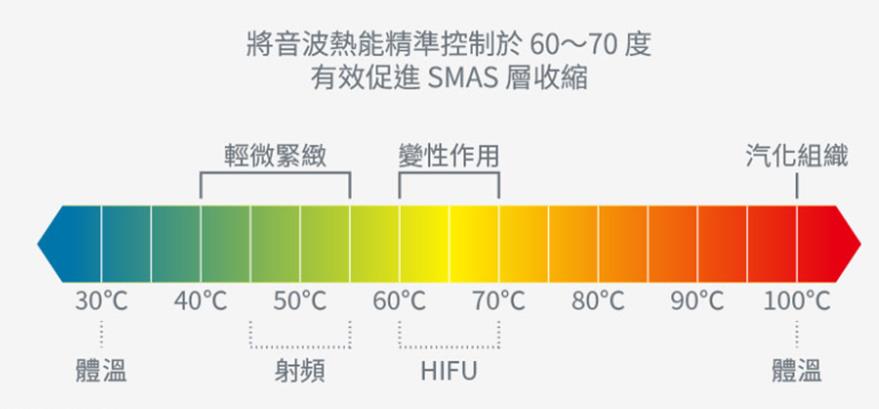臉部皮膚老化的成因,除了皮膚鬆弛和皮下膠原蛋白流失之外,也包括皮下筋膜層下垂位移,也就是SMAS組織層,聚焦音波使用不同治療深度的探頭,將熱能精準地藉由聚焦技術傳遞到皮膚的各種深度,從表皮、皮下組織到SMAS筋膜層,形成熱凝結點,藉由熱刺激讓原本下垂的組織進行收縮,並刺激膠原蛋白增生。
