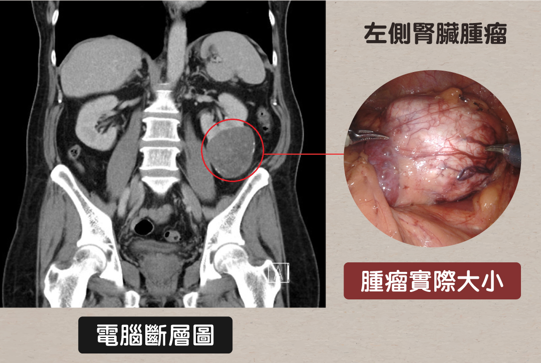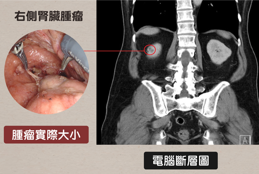 60多歲的阿伯發現兩側腎臟都有異常病變,不只右側腎臟上部發現一個約兩公分的腫瘤,疑似腎臟癌,左側腎臟下部也有一處約5.5公分的腫瘤。