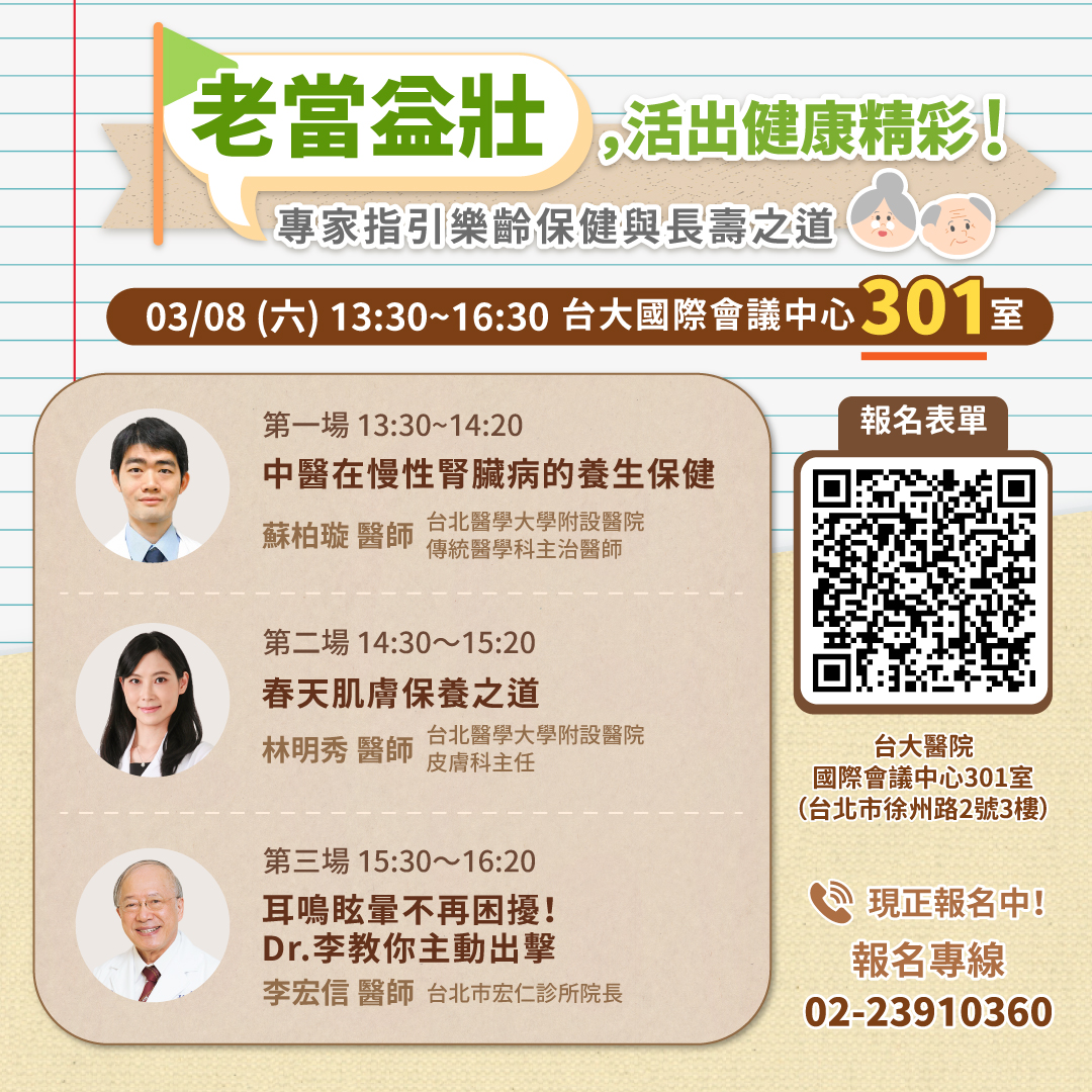名醫開講-免費健康公益講座,由臺北醫學大學校友會教育基金會、中華民國防高血壓協會、財團法人武聖關公文化教育發展基金會 共同支持主辦,每期邀請不同科別之專業醫師出席,傳達正確的保健新知,開放民眾免費報名參加,歡迎揪團預約報名喔!