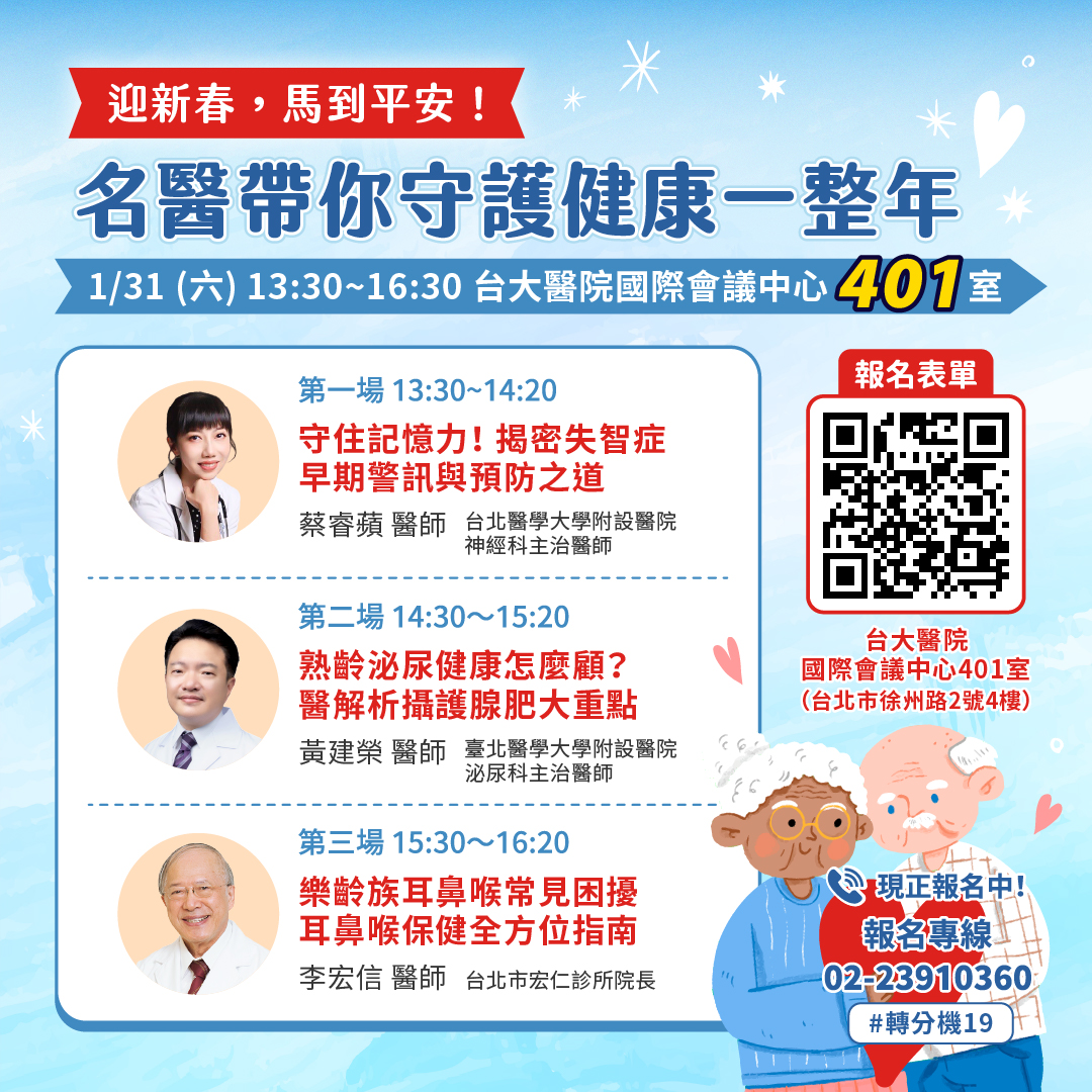 名醫開講-免費健康公益講座,由臺北醫學大學校友會教育基金會、中華民國防高血壓協會、財團法人武聖關公文化教育發展基金會 共同支持主辦,每期邀請不同科別之專業醫師出席,傳達正確的保健新知,開放民眾免費報名參加,歡迎揪團預約報名喔!