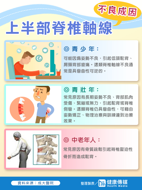 李佳龍指出,上半身骨骼軸線不良的成因引發隨各年齡層的表現而有所不同,青少年可能是因姿勢不良,具彎曲性可逆,但脊椎側彎嚴重會影響心肺功能;青壯年常因姿勢不良、背部肌肉受傷或緊繃、無力所引起,這類脊椎仍具彎曲性,可利用姿勢矯正、物理治療與訓練達到療效;中老年人則因骨質疏鬆導致脊椎壓迫性骨折而造成駝背,嚴重者會引起骨盆傾斜與下肢彎曲,關節肌肉無力難以行走,或因肥胖、腰椎退化、受傷所引起。