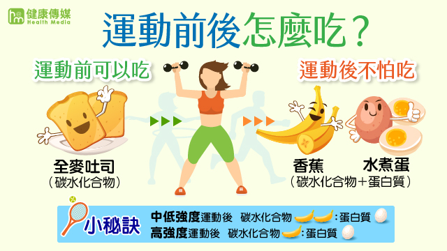 至於運動後是否該吃?邱柏豪表示,運動後身體已消耗掉許多能量,此時是身體吸收營養最好的時機,建議從事像跑步、游泳、有氧舞蹈等中低強度運動的人,可以碳水化合物與蛋白質2:1的比例來補充,如:兩片全麥吐司配一杯豆漿;若是從事高強度運動,如重訓、肌力訓練、高強度間歇運動等,則建議運動後要以碳水化合物與蛋白質1:1的比例來補充。如:一根香蕉配兩顆水煮蛋(不含蛋黃)。