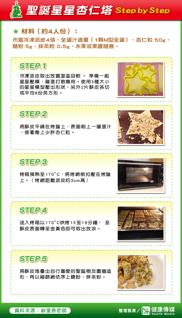 最後,可依個人喜好使用草莓果醬點綴「聖誕樹」,或切新鮮草莓擺飾在一旁,當然也可以使用其他水果替換搭配,如此即完成聖誕星星杏仁塔,供親友觀賞又可共同分食,重要的是在這個特別的節日裡,能增進彼此的感情。