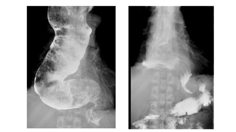 經上消化道內視鏡檢查發現,食道大幅彎曲擴張,且充滿未消化的食物。以食道鋇劑攝影觀察食道呈S型彎曲與鳥嘴型表現,吞入的顯影劑停留在食道無法進入胃部。進一步接受新一代高解析度食道動力學檢查,發現食道收縮蠕動功能喪失合併下食道括約肌壓力增加,確診為食道遲緩不能症第1型,在接受經口內視鏡下食道括約肌切開術(POEM)後,第2天即恢復進食且無吞嚥困難症狀,1個月後體重恢復,順利解決了10多年來的困擾。