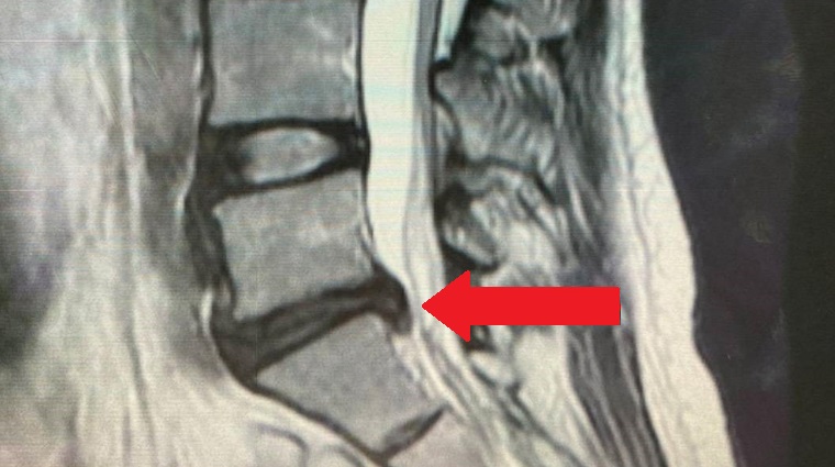 ▲紅色箭頭處為MRI影像椎間盤突出位置。(圖/亞洲大學附屬醫院提供)