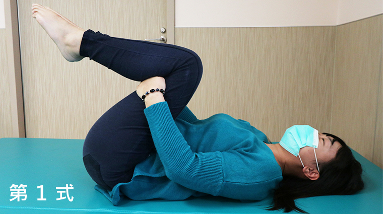 第1式:背部緊貼地板,雙手從膝蓋後面抓緊雙腿,配合呼吸持續壓推腿部至少7秒。