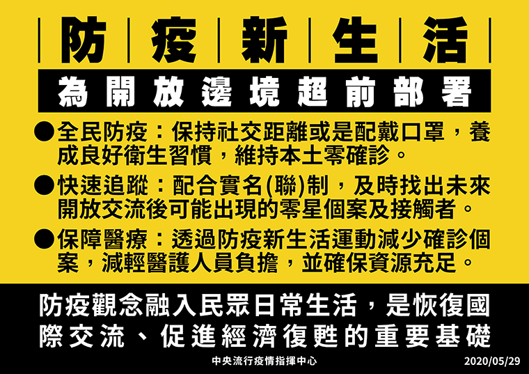 指揮中心指揮官陳時中強調,台灣目前不需要普篩,而是需要民眾內化防疫新生活,養成戴口罩、勤洗手、保持社交距離習慣,到公眾場合維持實聯制,都是為了開放邊境超前準備。如果台灣永遠封鎖邊境,現在什麼都可以不用做,但台灣不可能鎖國,經濟肯定會崩潰,一旦邊境開放,就要靠防疫習慣降低社區風險。