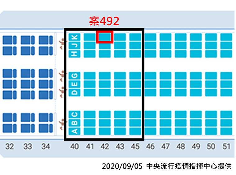 ▲第492例回台時搭乘班機座位。(圖/中央流行疫情指揮中心提供)