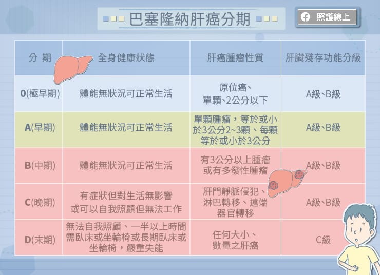 ▲巴塞隆納肝癌分期,將肝癌情況分成以上這些分期。(圖/照護線上提供)