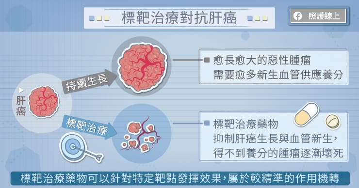 較晚期的肝癌,過去是以化學治療為主,隨著藥物進步,近年來標靶治療的選擇愈來愈多,可用於第一線、第二線的治療。肝癌細胞具有不同的標記,標靶治療的藥物會與特定標記結合、作用,進而阻斷癌細胞生長的傳導途徑,讓它無法繼續分裂,屬於較精準的治療機轉。
