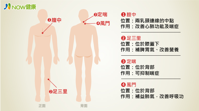 足三里位於膝蓋下約4橫指、脛骨旁開1橫指處,針灸此穴位可補脾胃氣、改善營養、增強肌肉力量;風門位於背部第2胸椎棘突下旁開1.5寸處,約與肩胛骨上角相平,此穴位可補益肺氣,改善呼吸功能;膻中位於前正中線上,2乳頭連線的中點,此穴位可補益肺氣及全身之氣、改善心肺功能及喘症;定喘位於背部第7頸椎棘突下,旁開0.5寸,可抑制喘症。