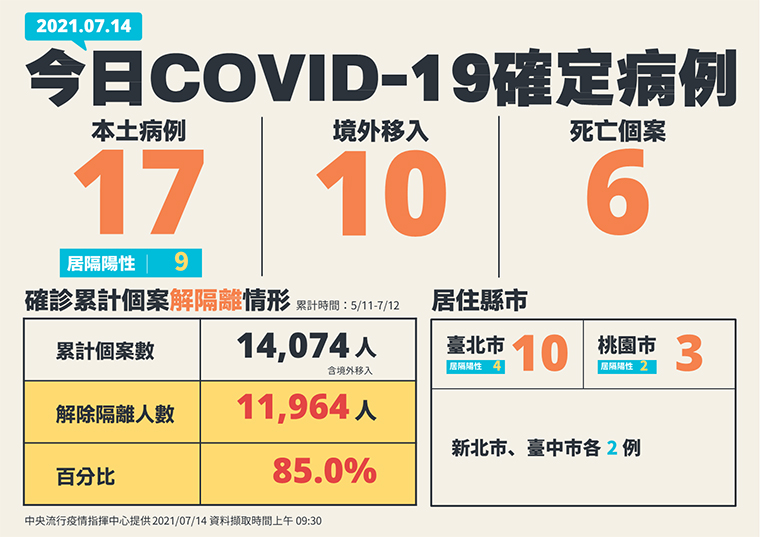 陳時中表示,今日新增17例本土病例,當中9例為居家隔離期間或期滿檢驗陽性者,分別為11例男性、6例女性,年齡介於未滿10歲至80多歲,發病日介於今(2021)年7月7日至7月13日;統計5月11日至7月12日累計公布14,074位確診者,已有11,964人解除隔離,占確診人數85.0%。